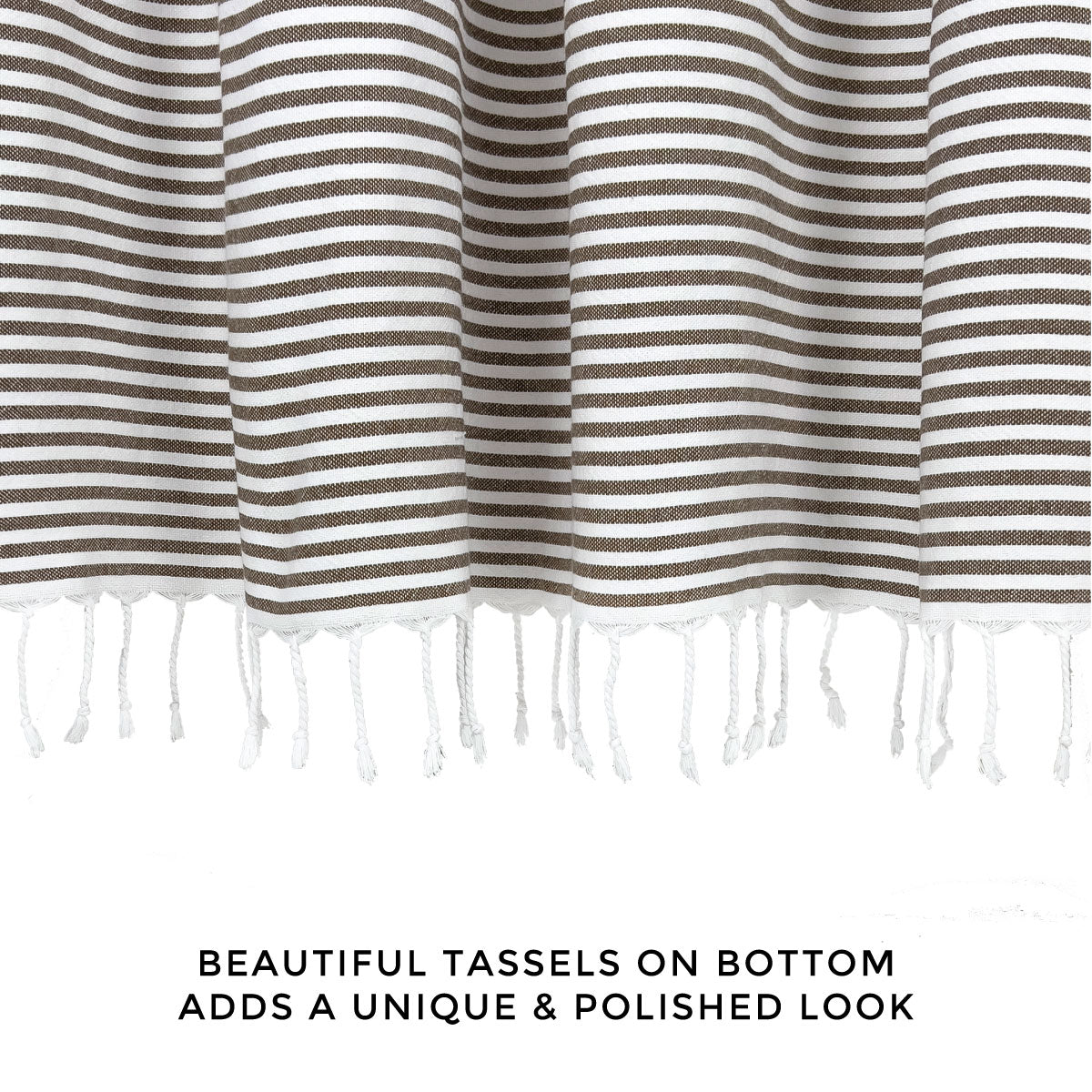 - Material - Made with 100% woven cotton. Hangs perfectly in your bathroom and leaves you with a clean, modern aesthetic. The bottom tassels give it an elevated twist while staying sophisticated and clean.